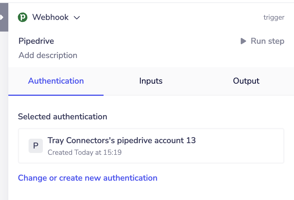 - Choose an existing Pipedrive auth or click Create new authentication and follow the OAuth flow.